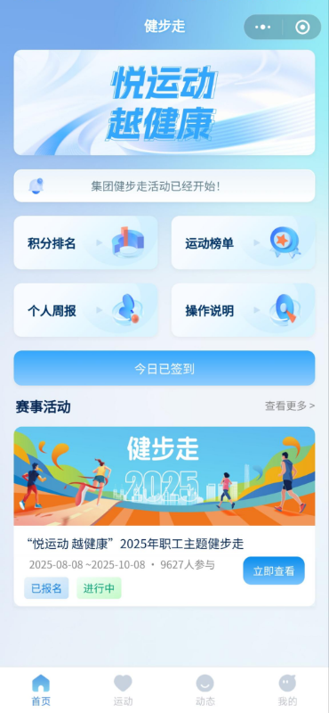 該小程序為響應三峽集團工會“悅運動越健康”主題健步走活動研發(fā),聚焦職工實際需求,融合前沿技術(shù),實現(xiàn)“功能全、操作簡”。無需額外下載APP,進入微信小程序完成報名后,依托微信運動功能就能實時獲取當日運動步數(shù)。小程序可精準記錄每日運動數(shù)據(jù),自動生成周報與月報,職工可清晰掌握運動軌跡。同時根據(jù)累積步數(shù)規(guī)則推送健步走知識問答,引導職工科學健身。職工完成活動任務(wù)還能獲得積分獎勵,大大增強職工健身成就感,提高參與積極性。小程序通過數(shù)字化手段為集團廣大職工帶來全新的健步走體驗,不僅助力集團公司積極踐行國家全民健身戰(zhàn)略,更在推動職工養(yǎng)成文明健康生活方式、提升身體素質(zhì)等方面發(fā)揮著重要作用。